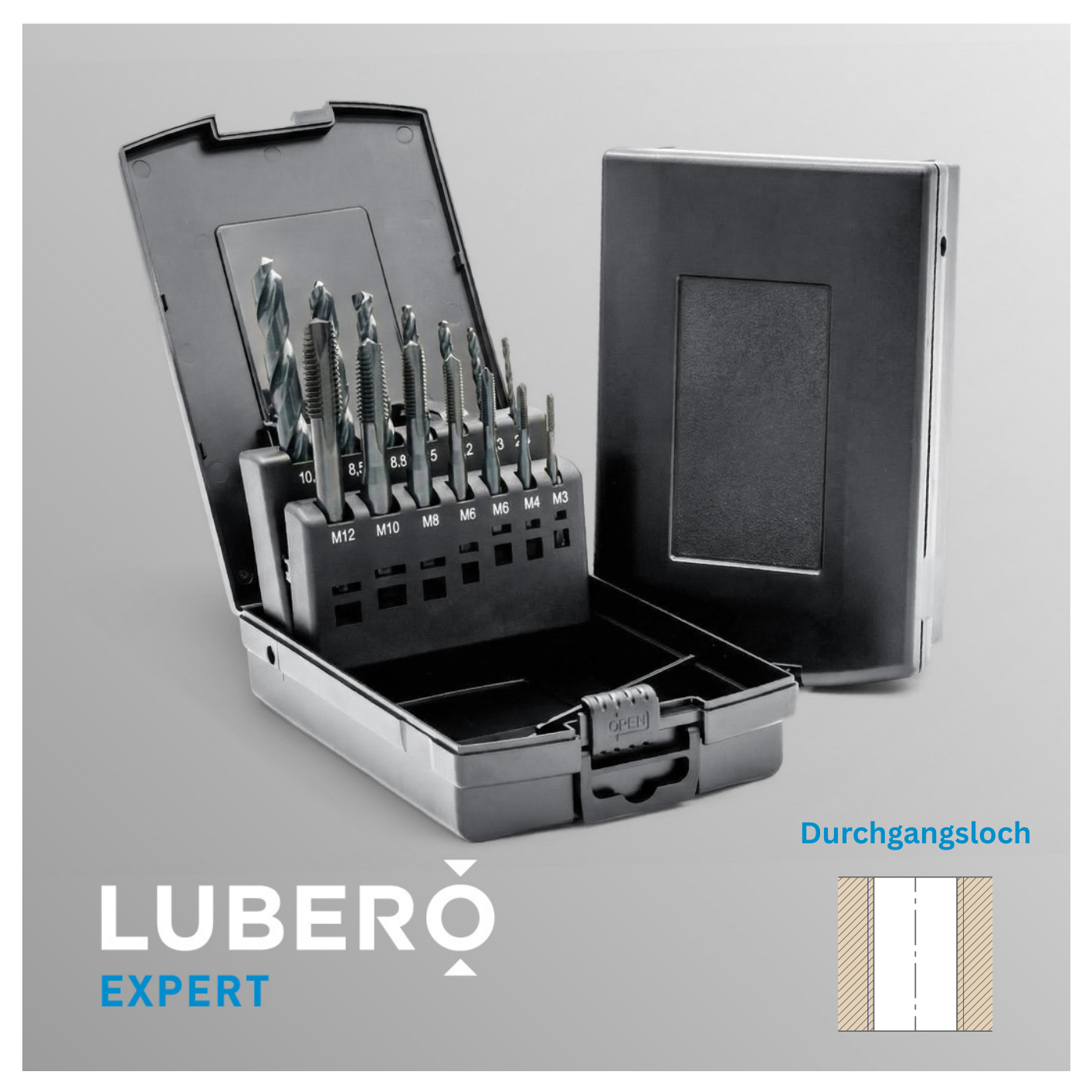 Das LUBERO Maschinengewindebohrer Set bietet eine breite Auswahl an unterschiedlichen Ausführungen, die für fast alle gängigen Werkstoffe geeignet sind. Es ist in einer praktischen Setbox aus robustem Kunststoff erhältlich, die wiederverwendbar und mit passenden Fächern für Maschinengewindebohrer in den Größen M3 bis M12 und den zugehörigen Spiralbohrern ausgestattet ist.